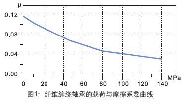 缠绕轴承的摩擦系数为0.03~0.12,影响摩擦系数的主要因 素有承载、运动方式、速度以及相配轴的表面粗糙度等。 图1显示了缠绕轴承在PV旋转载荷下的摩擦系数随着载荷的 升高而降低。
