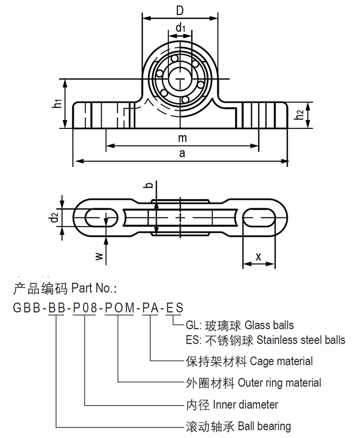 球体采用高耐磨材料EPB15制成 保持器采用高强度和尺寸稳定性材料M163制成 连接器采用高强度铝合金 自润滑、免维护 无噪音和易安装 轴承相对角度可调节 中心距根据需求